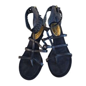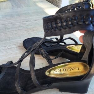 LAUREN Ralph Lauren Women's Meira Wedge Gladiator Sandals Black & Gold zipper backSize 8.5 B Pre-owned