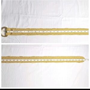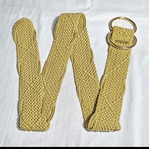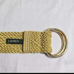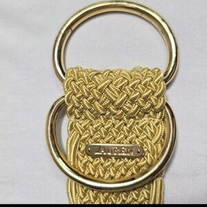 The Lauren Ralph Lauren Wide Gold Braided Woven Belt in XL size is a stylish accessory for women with a waist size of 44 inches. This textured belt features a wide width and stainless steel accents, including a logo plaque. The braided design and D-ring closure add a fashionable touch to the belt, making it a versatile and trendy addition to any outfit. Perfect for adding a touch of glamour and sophistication to your wardrobe, this belt is ideal for those looking for a statement piece to elevate their look.