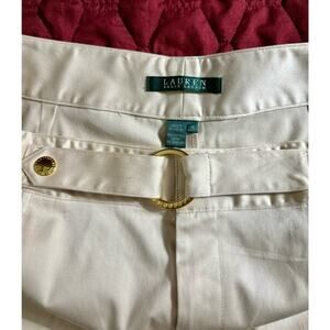 These are Lauren by Ralph Lauren slightly flared khaki pants size 14, cotton and 35 spandex for a little give. front belt that loops through gold circle that has Ralph Lauren with snaps on it.