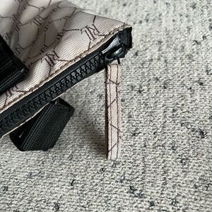 Used but good condition. Measures approximately 16.5 inches across by 11.5 inches height. 9 inch handle drop Zippered closure. Nylon straps. Durable material. One exterior pocket. No known tears or flaws