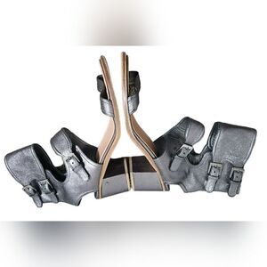 Anthracite metallic leather Laurence Dacade Herlin multi-strap sandals with tonal stitching, covered block heels and gunmetal buckle closures at ankles
