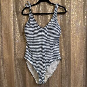LAUREN Ralph Lauren Blue Striped Lace Up Back One Piece Swimsuit Size 16