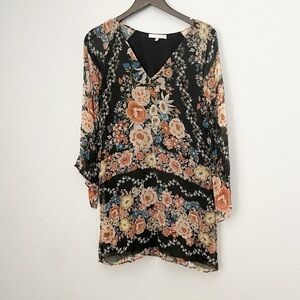 LAVENDER BROWN Black Floral V-Neck Long Sleeve Shift Mini Dress Small