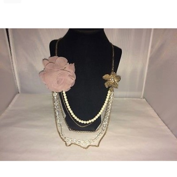 PRETTY LAVENDER CLOTH FLOWER GLASS & FAUX PEARL BEADED 5-STRAND NECKLACE
