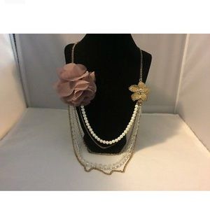 LAVENDER CLOTH FLOWER GLASS & FAUX PEARL NECKLACE