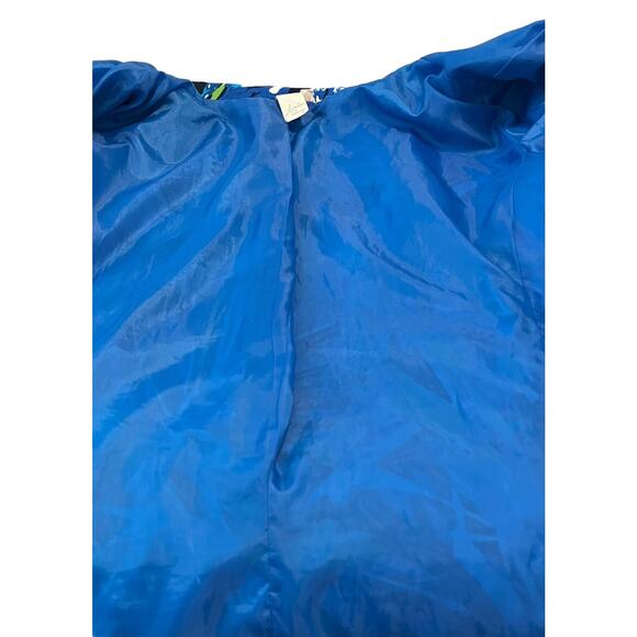 This gorgeous casual to dressy blazer/jacket is the perfect addition to your wardrobe - wears well with a skirt or slacks; Fall & Winter! Beautiful shades of Blue & Yellow, White & Green; 2" wide stand-up collar; open front with placket; padded shoulders; fully lined; notched lapel; 3/4 sleeves with 2" wide notched sleeve cuffs