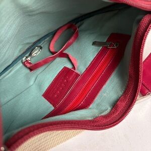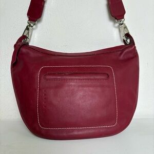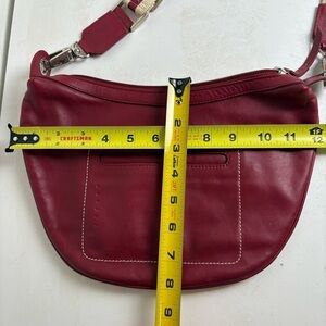 Good condition with minor marks on exterior and some faint white along leather edges. Shoulder strap has some subtle discoloration.