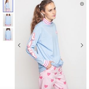 Lazy Oaf 'Lazy' Long Sleeve Tee in baby blue with white and pink patch letters. This super comfy oversized t-shirt features fuzzy chenille lettering along the right sleeve and left chest. Ribbed pink/white mock neck and cuffs. We love playing off this tee's super oversized fit by pairing it with straight leg trousers, or you can tuck the front into high waisted bottoms for a more fitted look. This tee comes in one size. 100% cotton. Machine wash.