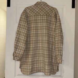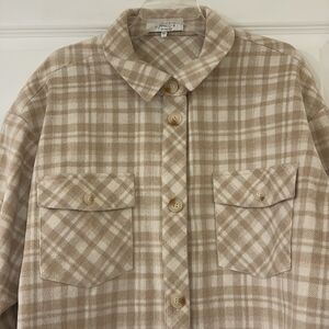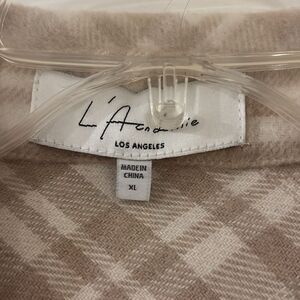 L’Acadamie Zuma Plaid Beige Women's Oversized Shacket, size XL. Excellent used condition. Stylish plaid beige top perfect for casual outings. Comfortable and chic, this top is a must-have for your wardrobe. 80% Polyester, 20% Wool; Lining 97% Polyester, 3% Spandex