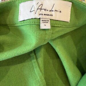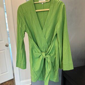 L’Academie Los Angeles mini dress in vibrant green. Features a deep V-neckline, long sleeves, and a flattering wrap design with an adjustable tie waist. Crafted in lightweight linen blend, perfect for dressing up with heels or wearing casually with sandals. Excellent condition. Size Large.