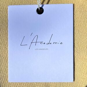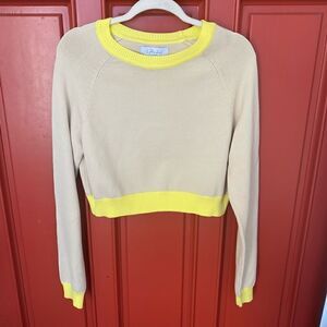 L'Academie Los Angeles Revolve Tan with Yellow Striping Cropped Sweater. Size Large. NWT. Long Sleeve, scoop neck with soft buttery yellow stripping at collar, wrists and hem. Ships from a smoke and pet free home.