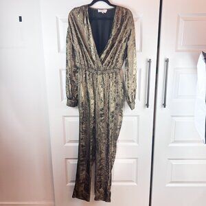 Revolve L’Academie Metallic Bronze Velvet Jumpsuit | Long Sleeve Deep V-Neck Holiday Party Outfit Size S