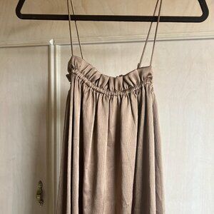 L'Academie Satin Paperbag Top Maxi Dress- Mocha/Brown Satin Poly Spandex blend. Purchased from Revolve for a photo shoot and not worn since the shoot. Was professionally dry cleaned, no stains or evidence of any wear. Tags still attached.