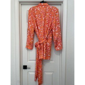 Absolutely stunning, perfect for summer. Tie belt, padded shoulders. Slight stain on right sleeve by wrist area. Please see photos. I’m sure with dry cleaning it would come right out. Worn once. Smoke free home