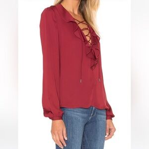 L’Academie The Ruffle Boho Blouse Cabernet crimson Lace up Tie Front Satin Burgundy. Size Small (oversized fit). Excellent condition.
