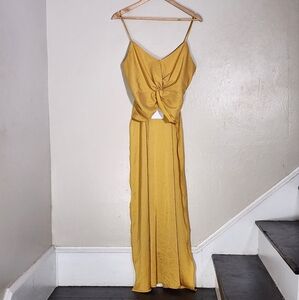 Elegant sleeveless dress in mustard yellow. Features a stylish knot detail.