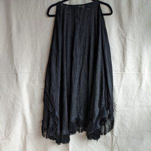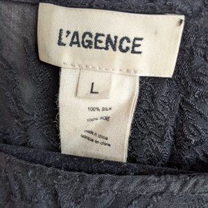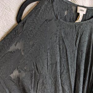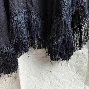 100% black silk dress L'Agence. Beautiful floral burnout pattern with a fringe all around the hem. Fabric is sheer, so this would work best with a slip underneath, or even as a swimsuit coverup. Bottom hem is like a semi-circle, so it's nice and full and perfect for twirling. Size L.