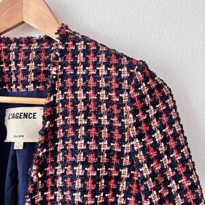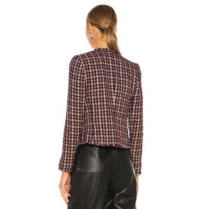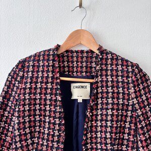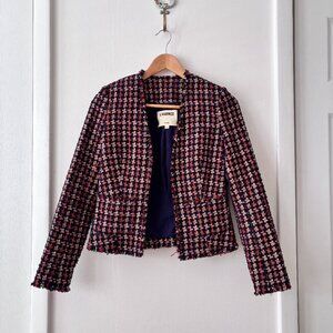 Self: 90% poly, 10% cotton.Lining: 100% poly. Dry clean only. Open front. Front slip pockets. Light fringe trim.
