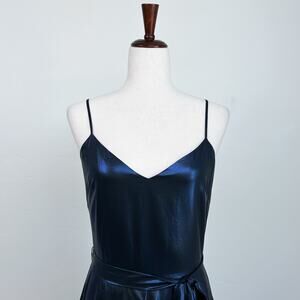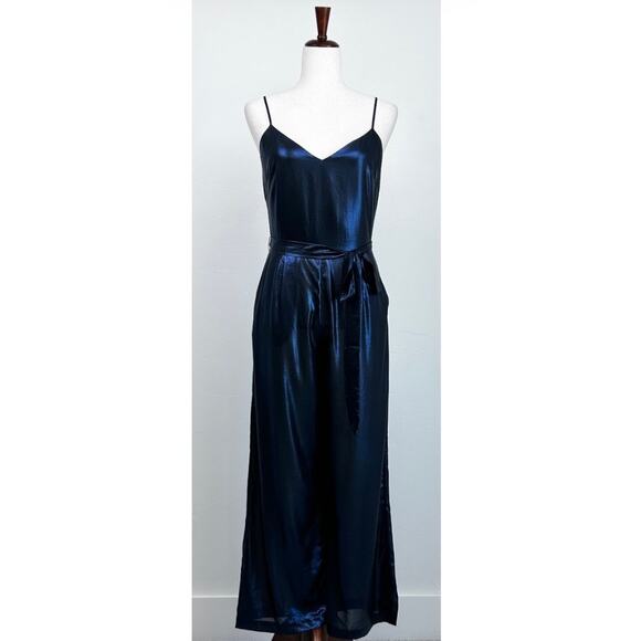 Size 2 L'Agence Jaelyn wide leg jumpsuit. Blue metallic fabric. The fabric content tag has been cut out but this is a very flowy, silky and lightweight polyester. The top half is lined, the bottom is unlined. Pockets! Self tie belt. Adjustable skinny straps. No flaws, great condition!