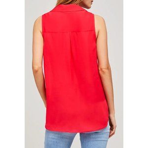 L'Agence Freja Draped Blouse in Hibiscus, size XS. Sleeveless, wrap-effect front with notched shawl collar. Cut from featherweight silk georgette. Features a hidden front button closure, back yoke inverted box pleat, and a shirttail hem. New with tag attached, but there is a small snag in the draping, see last photo. Also, please note this is a sample piece and does not have a fabric/care tag.