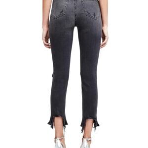 An artfully designed destructed high-rise skinny jeans in faded black. High-low tattered hem and perfectly placed distressed knees make a statement of refined modernity. An authentic denim hand is balanced by comfortable stretch and an ultra-soft feel.