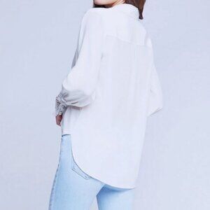 A chic blouse in ivory silk. Effortless high-low design has deep V-neckline framed by sharp lapels, faux-wrap front and back yoke. Exquisite guipure lace cuffs with button-loop closure add a vintage charm. L'AGENCE's Joah blouse boasts a wrap bodice and bubble hem. Crafted of a luxe silk, the look is finished with intricate tonal lace cuffs.