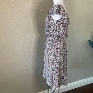 in a paisley floral abstract print. Ruffle off the shoulder silhouette, elasticized waist and slight high low flounce hem.