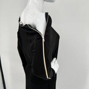 Slinky 100% viscose dress in black with elastic waistband. Lightly dolman sleeves are topped with a dual zipper that start from each sleeve cuff and zip all the way together at the neck. So, you can wear the neckline zipped to keep it on both shoulders, or unzip one side to create an off the shoulder look. At the end of the night, a sweetheart can unzip both sides and drop it to your waist. *ahem* Not that I am advocating that, of course. #blush