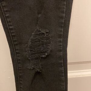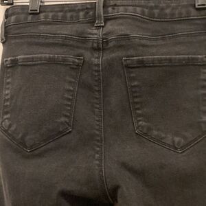 L’ Agence Margot black distressed high rise skinny jeans in zinc destruct wash. Faded black with heavy distressing on knees, 5 pocket style with button & zip front closure. Size 27.
