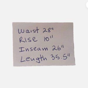 Measurements: waist 28", rise 10", Inseam, 26", Length 35.5"