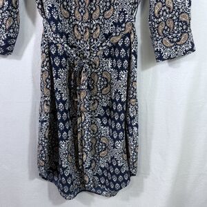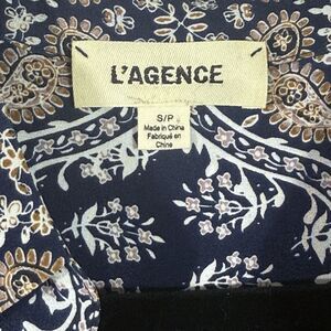 L'Agence Navy 100% Silk Paisley Tie Belt Hidden Button Front Shirt Stella Dress Size S Unlined Collared V-Neck 3/4 Sleeve Classic Contemporary Chic Sophisticated Workwear Career Office