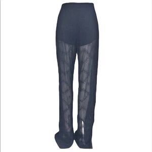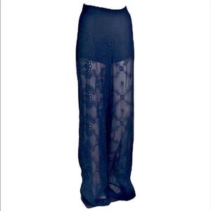 L’Agence Sheer Navy Eyelet Short-Lined Side Zip Wide Leg Pants Sz2 Sheer with floral eyelets in diamond pattern.