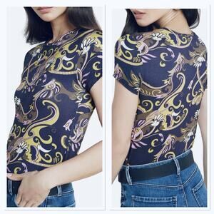 L'Agence Ressi Top Blue Olive Abstract Scarf Print Stretch Jersey Knit T-Shirt Blouse