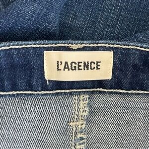 Crafted from a rich blue denim, these L'AGENCE jeans feature a timeless flare and wide leg silhouette. The medium to heavy weight fabric ensures durability and a flattering fit. Perfect for adding a touch of elegance to your everyday wardrobe.