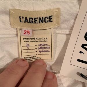 L'Agence Skinny Cropped Jeans with Ankle Zippers in white. Zip and button closure. Women's size 25. There is a stain on side towards top, but new with tags.