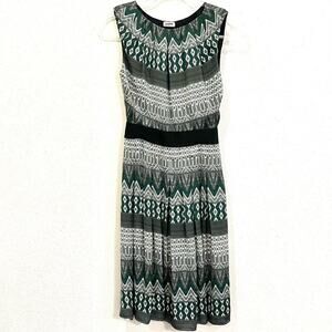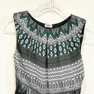 • Beautiful sleeveless silky-feel geometric print dress in shades of black, white, gray and a pop of green