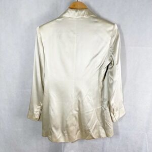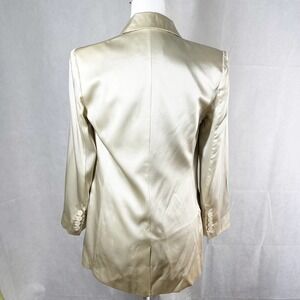 L'Agence Taryn Silk Satin Double Breasted Blazer Champagne Size 2. New with tag but has a minor flaw located in the back. Thread snag as shown in pic but hardly noticeable, heavily discounted because of this flaw. The fabric tag is missing but info taken from the website.