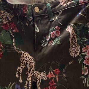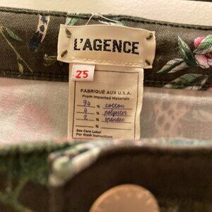 A gorgeous pair of stretch skinny pants by L'Agence. The color is an olive green with flowers and stylized cheetahs. These pants were very gently used, and are in excellent pre-loved condition. They are a size 25 but the spandex in the fabric offers a little wiggle room.