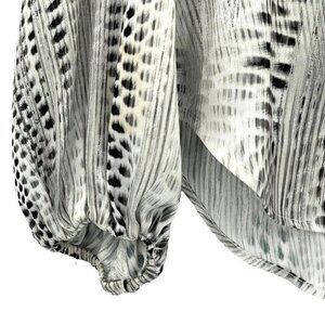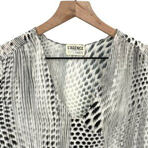 L’Agence exclusively for Intermix long sleeve v-neck silky blouse in a black and ivory mixed print. Looser, blousy fit makes this size 0 work for XS/2 as well.