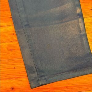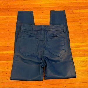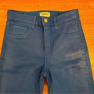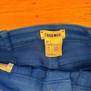 L’ Agence bright blue shiny skinny pants. 2 fake pockets in front. 2 pockets in back. Belt loops. 94% cotton, 4% polyester, 2% spandex. Waist across front 13 inches. Rise 10 inches. Inseam 25 1/2 inches. Small mark on left leg (shown in last photo). Size 27. Good condition.