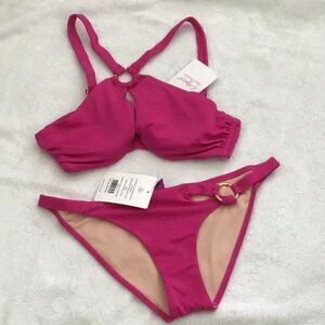 Brand New! Top has cut out keyhole in front.Padded top with molded cups for added comfort and style.Crisscross straps at the neck centered with gold eyelet.Adjustable straps.Bottom has off center keyhole in front.Cheeky coverage .