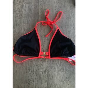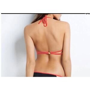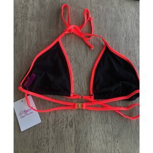 The Cari bikini combines a black base with neon melon straps creating a cutaway effect. The neon melon pops on the black base and if that isn't enough the hardware features gold. It ties at the neckline and can be adjusted. The back has a closure clasp. This top is sexy and playful. New with tags, no rips, stains, or damage.