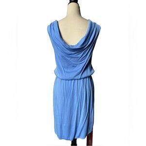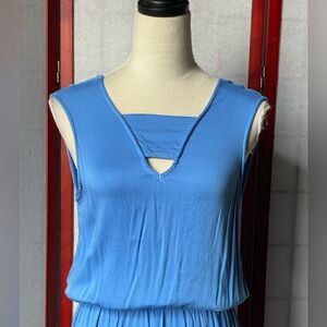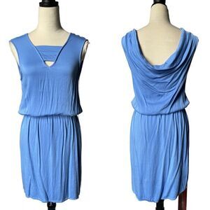 This beautiful blue sleeveless shift dress is incredibly comfortable with an elastic waistband and cut out on the chest. The back is semi-open with fabric that cascades down the back. Excellent preloved condition!