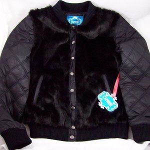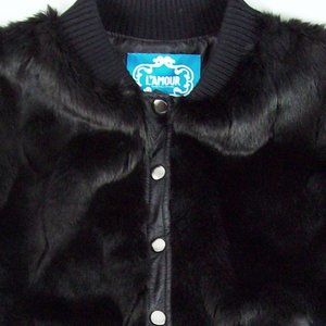 L'Amour Nanette Lepore Black Faux-Fur Varsity Jacket. Material is 46% Modacrylic, 36% Acrylic, 18% Polyester. Metal Snaps Closure. Quilted Long Sleeves. Slip Pockets. Lining and Fiberfill Polyester.