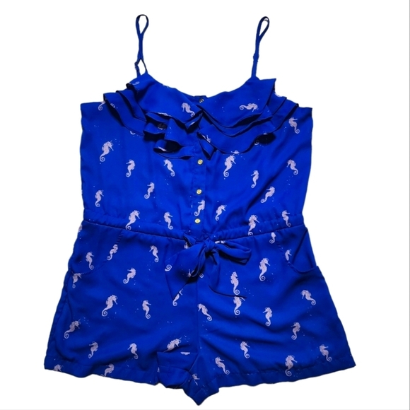L'Amour Nanette Lepore Seahorse Print Blue Romper Button-Up Sleeveless Ruffle