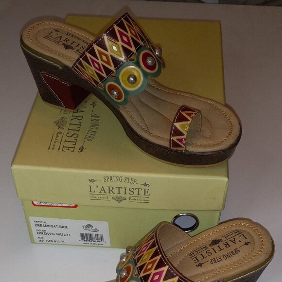 Worn Once pair of L'Artiste slip/slide on leather sandals w/Spring Step insole and toe strap. The style is Dreamcoat and fits like a 6.5. Heel is 2.5 inches and leather is hand painted. Comes with original box. The colors are brown, yellow, blue, pink with silver studded accents. Extremely comfortable & shoes have been sanitized.
