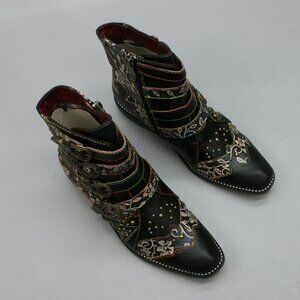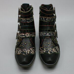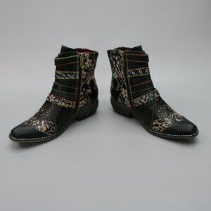 A pair of women's L'Artiste by Spring Step black leather side zipper ornate floral western cowboy boots