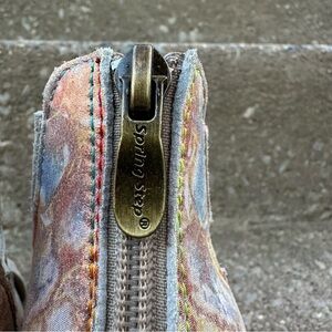 Hand painted embossed perforated leather, contrast color stitch detail, stacked set-back heel. Back zipper. Synthetic leather lining. Synthetic leather padded insole. Rubber outsole. Size 35 or US 5. Excellent used condition.