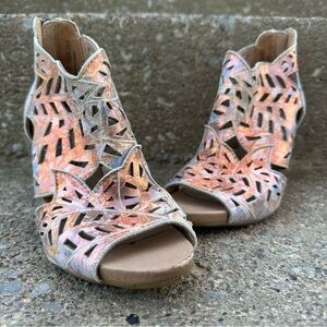 L'Artiste Amora Hand Painted Leather Peep Toe Laser Cut Bronze Sandal