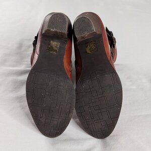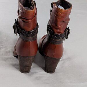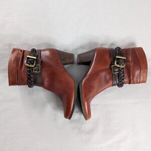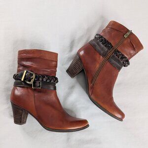 L'Artiste Brown Cognac Leather Braided Buckle Stacked Heel Boots